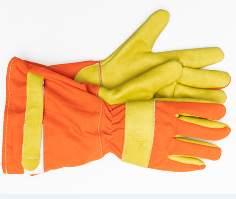 Dorso e manichetta (cm. 18) in tessuto meta-aramidico foderati in maglia meta–aramidica, rinforzo al dorso in pelle pieno fiore in corrispondenza delle nocche. Nella parte bassa del palmo un rinforzo salva vena in pelle pieno fiore, dorso elasticizzato. Cuciture realizzate in filato di Kevlar®.